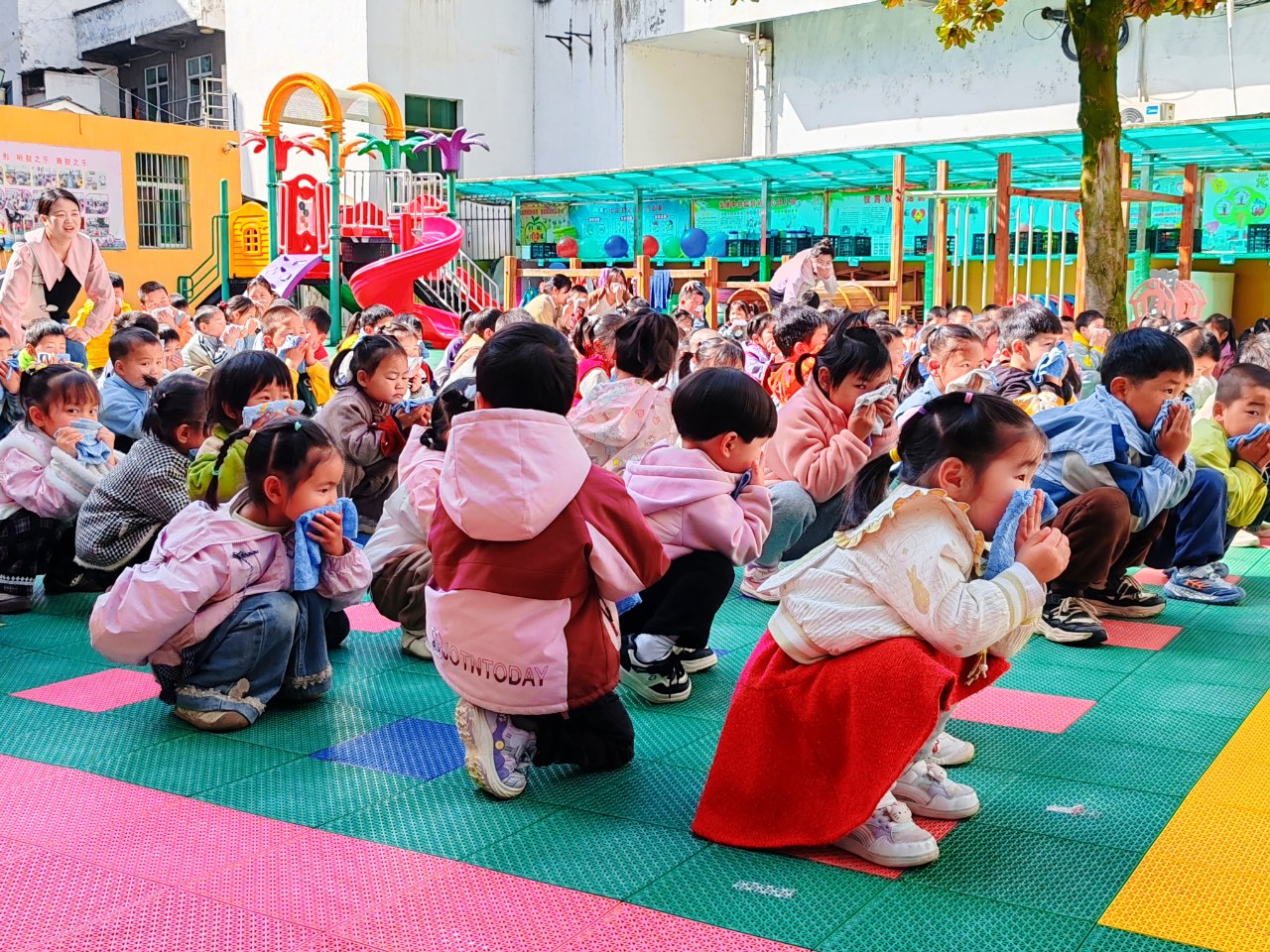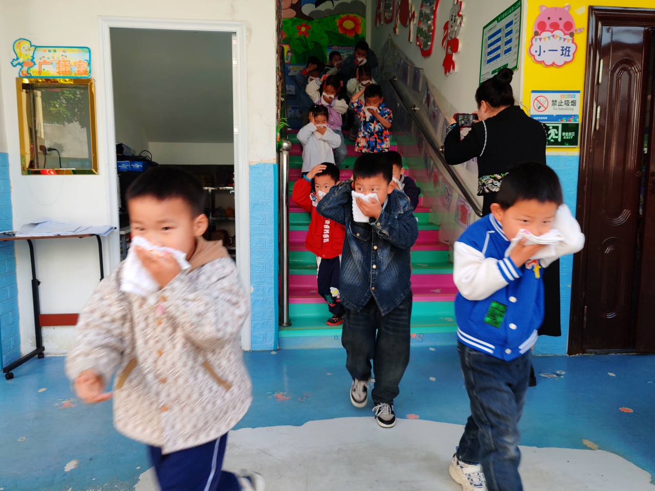 隨著急促的警報聲響起,各班教師立即按照應(yīng)急預(yù)案,引導(dǎo)幼兒用濕毛巾捂住口鼻、彎腰低姿前行,沿預(yù)定疏散路線快速、有序地撤離至操場安全區(qū)域。整個過程緊張有序、行動迅速,未出現(xiàn)擁擠、碰撞等情況。