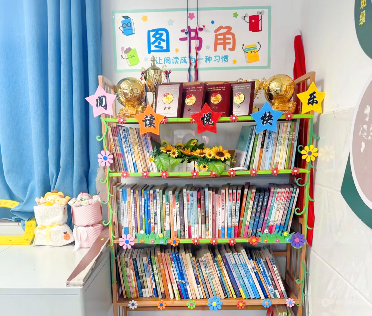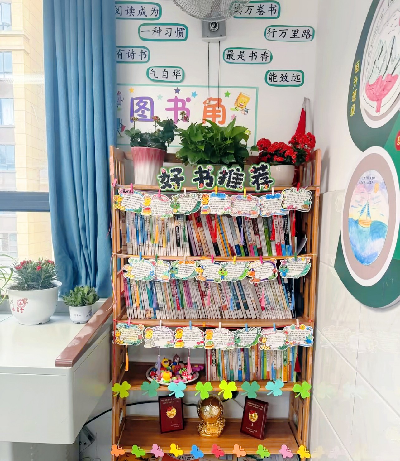 評(píng)比現(xiàn)場(chǎng),各班級(jí)圖書角特色鮮明。有的書架擺放規(guī)整、分類清晰,搭配溫馨閱讀角落;有的完善借閱、維護(hù)制度,管理規(guī)范;有的張貼讀書名言、好書推薦卡,氛圍濃厚。細(xì)節(jié)之處盡顯師生對(duì)閱讀的熱愛與文化魅力。
